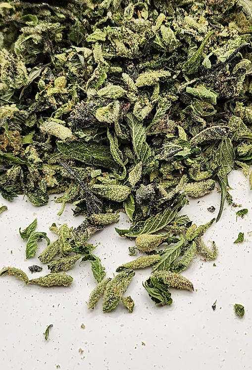 This frosty cannabis trim is characterized by its abundant trichomes, which are the tiny, hair-like structures on the surface of the cannabis plant that produce and store cannabinoids and terpenes. The high concentration of these trichomes not only gives the trim its frosty appearance but also indicates a rich profile of active compounds, making it a valuable resource for both recreational and medicinal users.